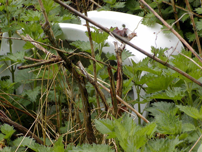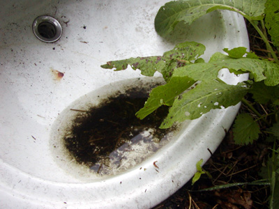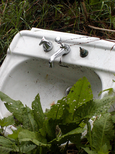 …dieser Art sieht man zum Glück nicht sehr häufig. Es scheint so, als hätte sich ein Zeitgenosse ein Freiluftbad mit ausrangiertem Waschbecken und Klo errichtet. Dies Mahnmal der Asozialität fand ich gegenüber des Eingangs zu einem kleinen Wäldchen und jeder Spaziergänger muß, ob er will oder nicht, dies Kunstwerk bewundern. Inzwischen beginnen  Brennesseln   dies Arrangement zu überwuchern. Es bekommt dadurch ungewollt etwas Wildromantisches! Jedoch frage ich mich ernsthaft, ob dem Hersteller dieses Objekts,  Natur allein zu langweilig erscheint, dass er glaubt, sie mit Haushaltsmüll aufwerten zu müssen?