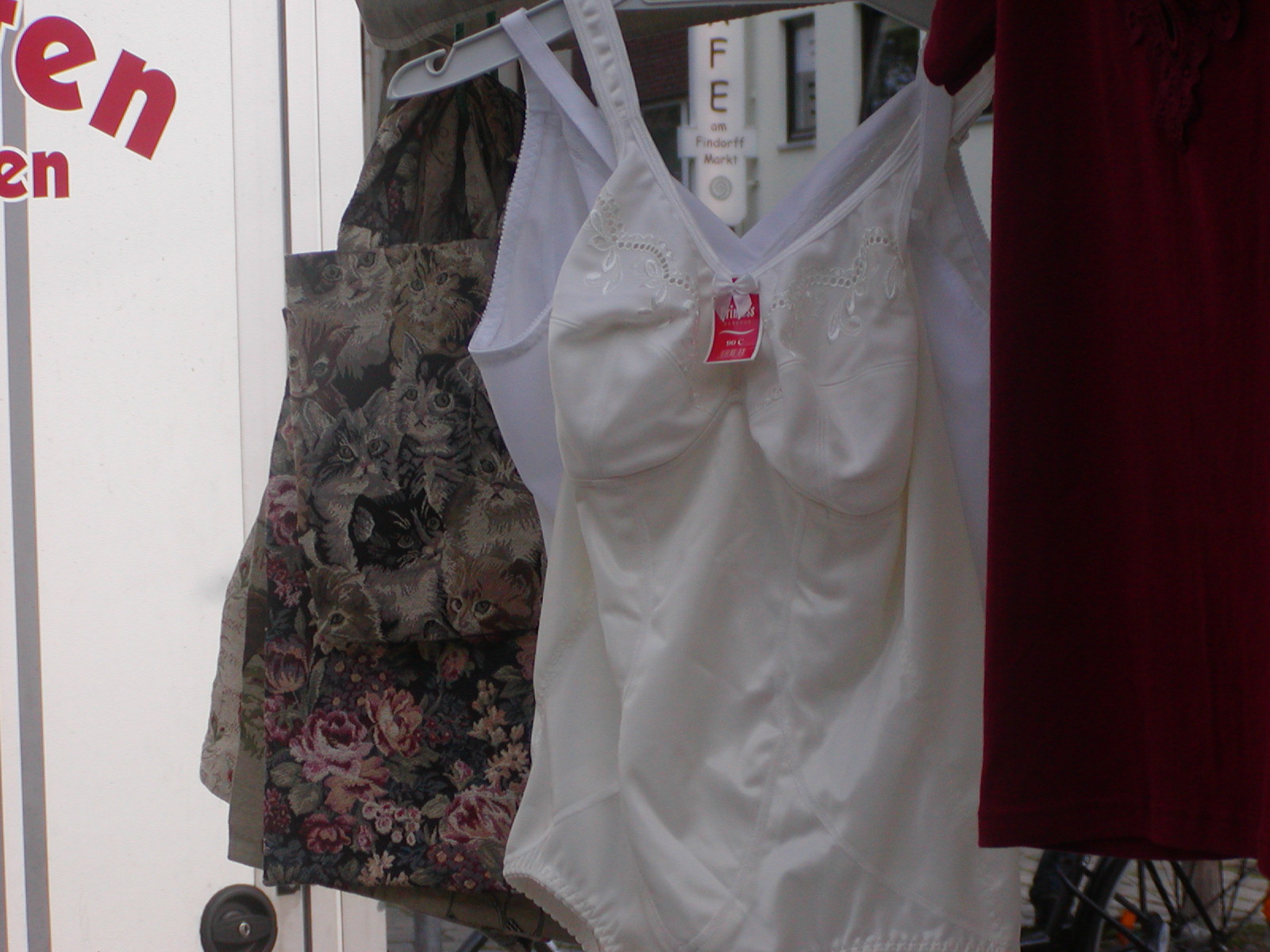 …sozusagen im Vorübergehen und selbstverständlich ohne anzuprobieren. Unterwäsche wird feil geboten an einen Stand auf dem Wochenmarkt. Da muß sich Frau über ihre Größe schon verdammt sicher sein!