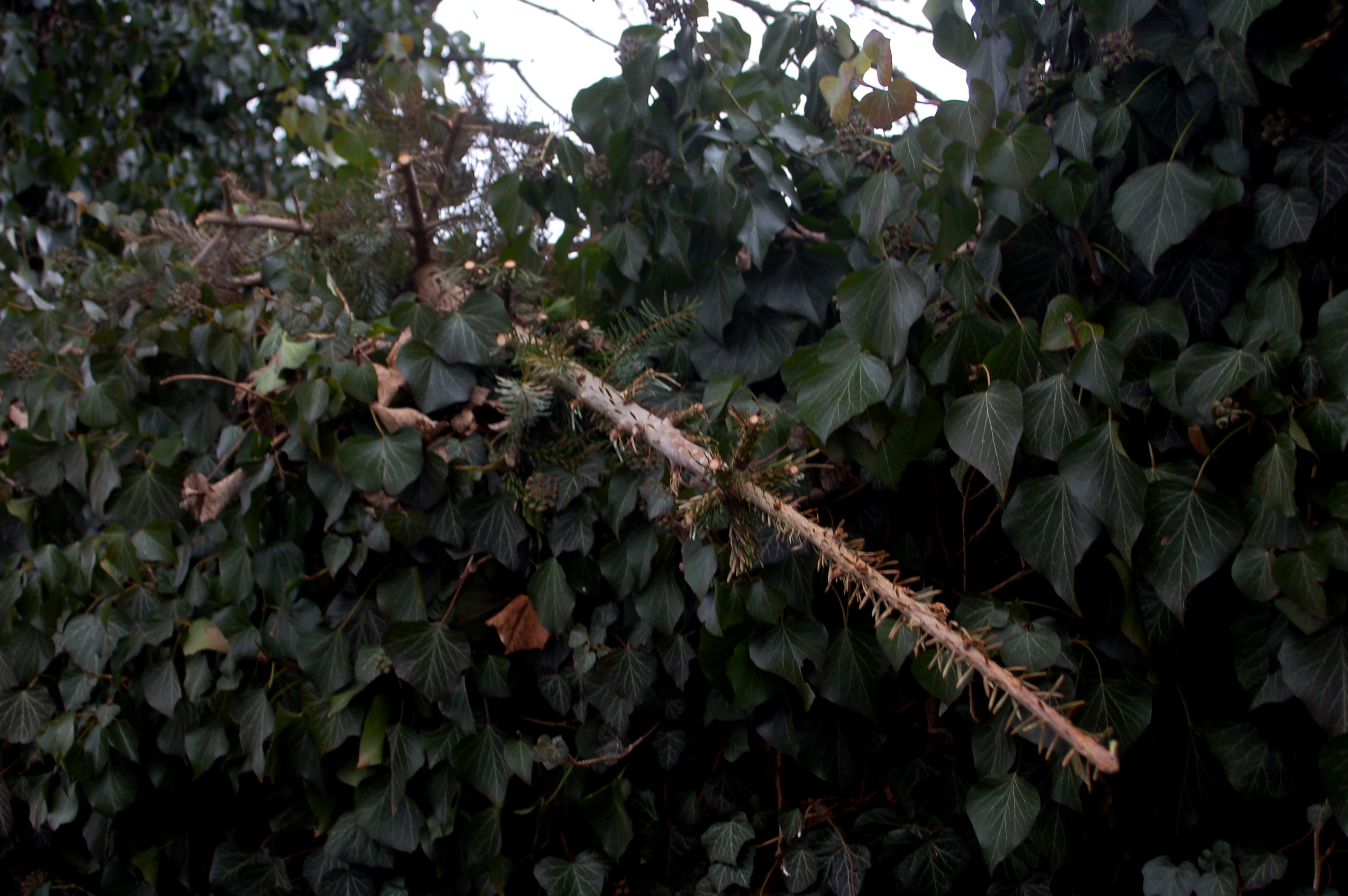 um Weihnachtsrückstände los zu werden! Zunächst stand diese all ihrer Pracht beraubte Weihnachtsbaumruine einsam mitten unter den Mülleimern am Tag der Müllabfuhr. Natürlich erbarmte sich niemand der Müllleute und nahm sie mit, denn für Weihnachtsbäume gibt es halt einen einen Extratermin! Sie stand auch weiterhin an unsere Hecke gelehnt. Dann von heute auf morgen schien sie verschwunden, so als hätte sie sich selbst auf die Socken gemacht, sich also von allein entsorgt!