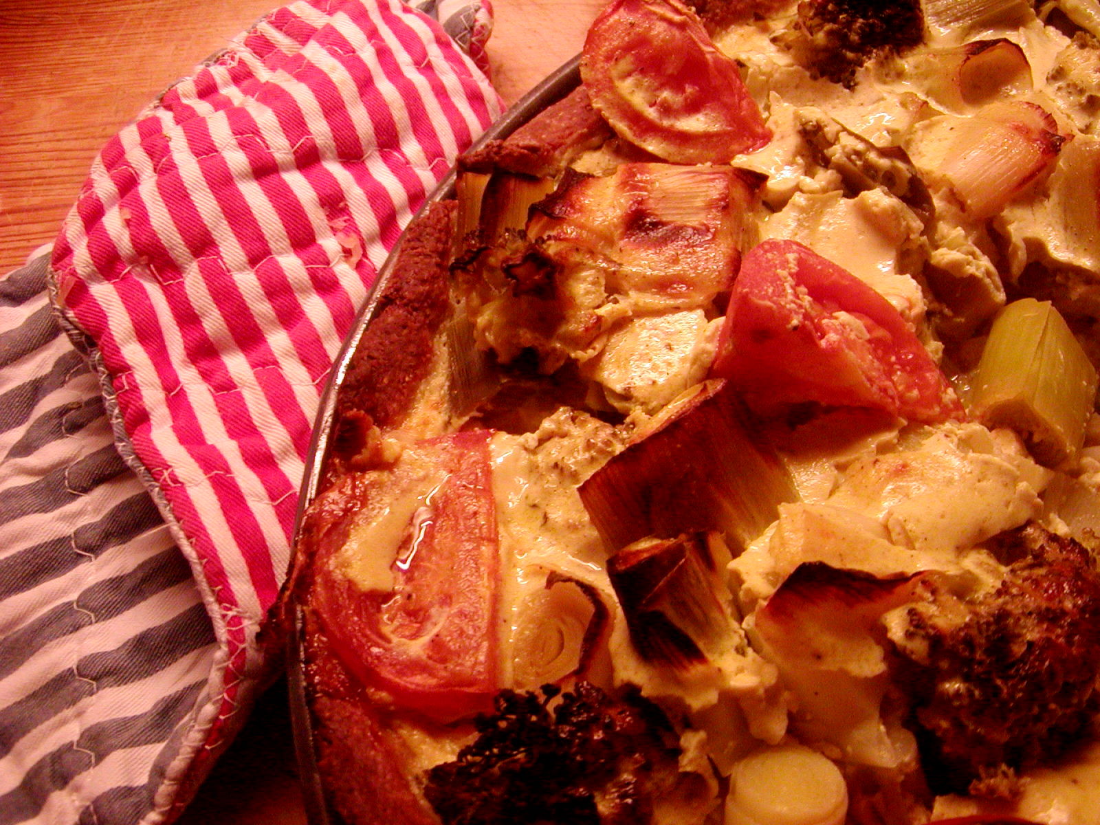 Mit Lauchstangen Brokkolie und Tomatenviertel