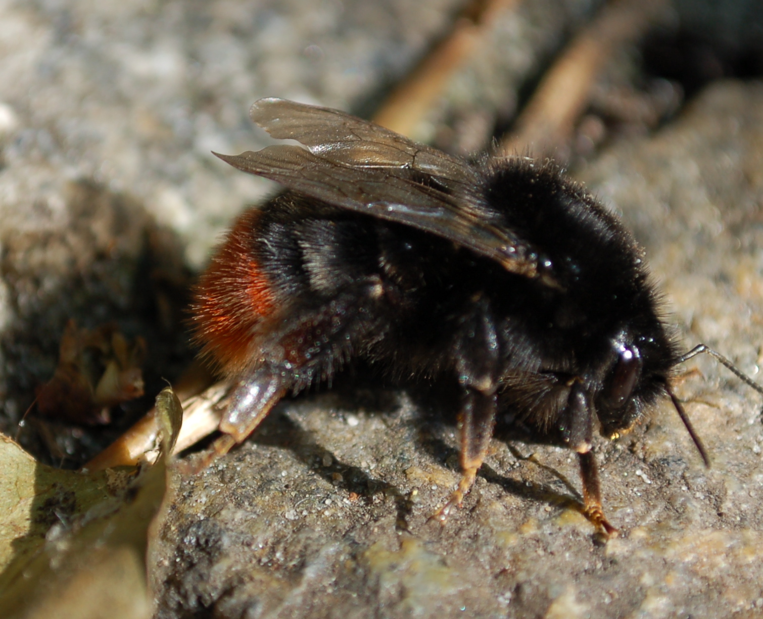 …eine Erdhummel in unserem Garten auf der Suche nach einem geeigneten Nest oder Bau!
