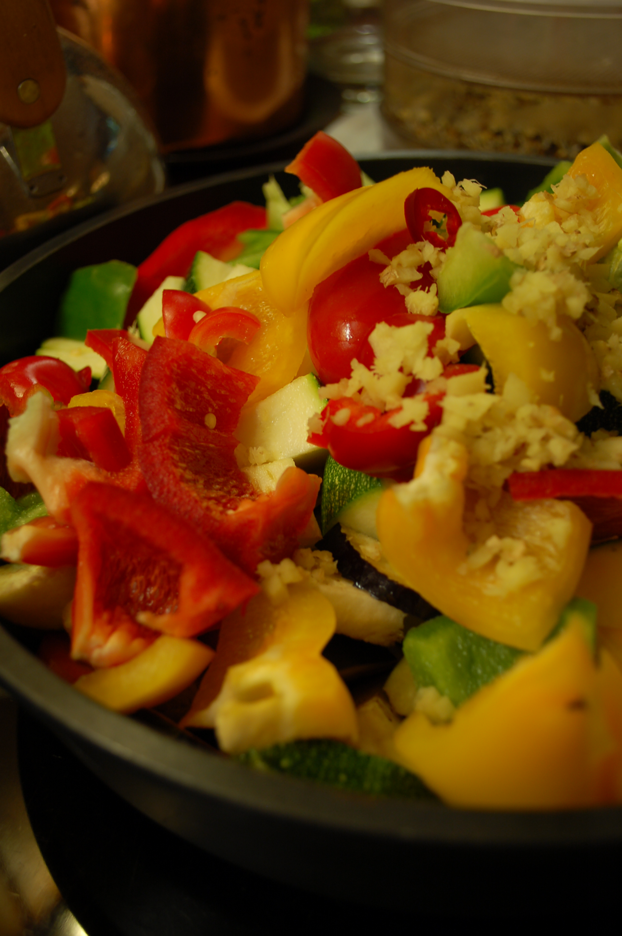 Eine Aubergine, eine Zuchini, zwei größere Möhren, drei Paprikaschoten, gelb, rün, rot, Champingnons weiß oder rose oder auch andere Pilze wie Chitake, ein Stück Ingwer und ein paar Scheiben Peperoni. Alles in Stücke oder Scheiben schneiden. Dann ab in eine Pfanne, Gemüsebrühe dazu, einen guten Schuß Weißwein hinzugeben. Köcheln lassen. Würzen mit Zimt, gemalene Nelken und Curry und einem Eßlöffel Honig, Öl oder Butter abschmecken. In etwa zwanzig Minuten ist das Gericht gar. In der Zwischenzeit Parboiled Reis garen und zur asiatischen Gemüsepfanne servieren!