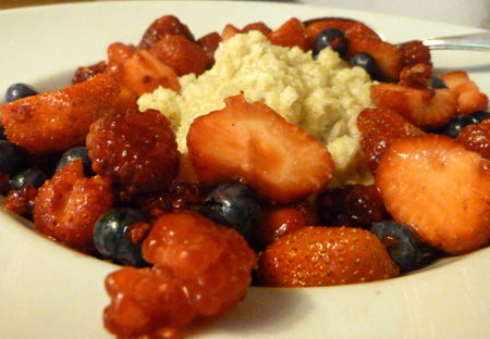 Naturvanille, etwas Zimtpulver und zwei bis drei Eßlöffel Rohrohrzucker hinzufügen, dann 150g Hirseflocken und 150g Reisflocken einrühren, von der Platte nehmen und einfach quellen lassen, zwischendurch umrühren!