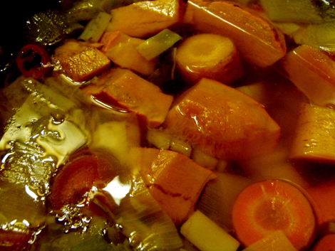 eine Porreestange, drei oder vier Möhren, eine viertel Sellerieknolle, drei bis vier geschälte Kartoffeln, vier Scheiben Pepperoni, ein bis anderthalb Liter Wasser, Gemüsebrühe, drei Scheiben Ingwer.