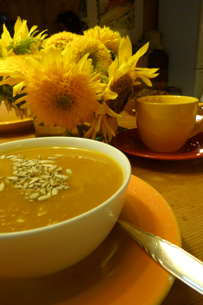 Servieren kann man die Suppe mit ein wenig Kürbiskerne oder Sonnenblumenkerne. Wer will kann zur Suppe ein gebuttertes Vollkornbrot essen.