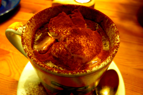 Obenauf ein großen Klacks Honigsahne. Bestäubt wird das Ganze noch einmal mit ein wenig Kakao!