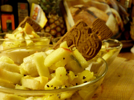 geht so:500 Gramm Vanillejoghurt auf Gläser verteilen. Dann zwei Bananen in Scheiben, einen Apfel und eine Birne in Streifen, zwei Kiwis in Stücke zerteilen, in einem Behälter mischen, auf den Joghurt schichten und jedes Glas mit einem Spekulatius verzieren!