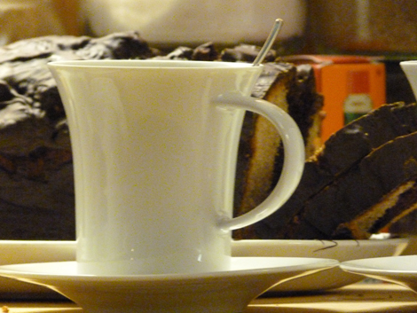 Zum Dessert heiße Schokolade mit Sahnehäubchen und ein Stück Marmorkuchen…