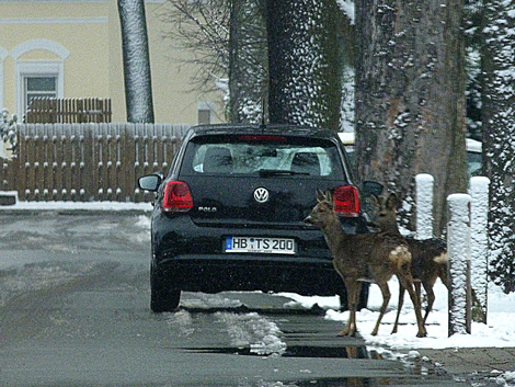 …hatten sich die beiden Rehe und geisterten an einem Sonntagvormittag über Oberneulands Straßen. Nach längerem Suchen bogen sie in den Vorgarten eines Einfamilienhauses ein. Zwar keine endgültige Lösung, jedoch waren sie dort wenigstens sicher vor den, für sie sehr gefährlichen Autos! Vermutlich dauert der Winter doch ein wenig zu lange und das Futter geht dem Rotwild allmählich aus! Ohne Futternotstand kämen diese scheuen Wesen kaum auf die Idee sich am hellichtem Tage, bei ihren Erzfeinden blicken zu lassen!