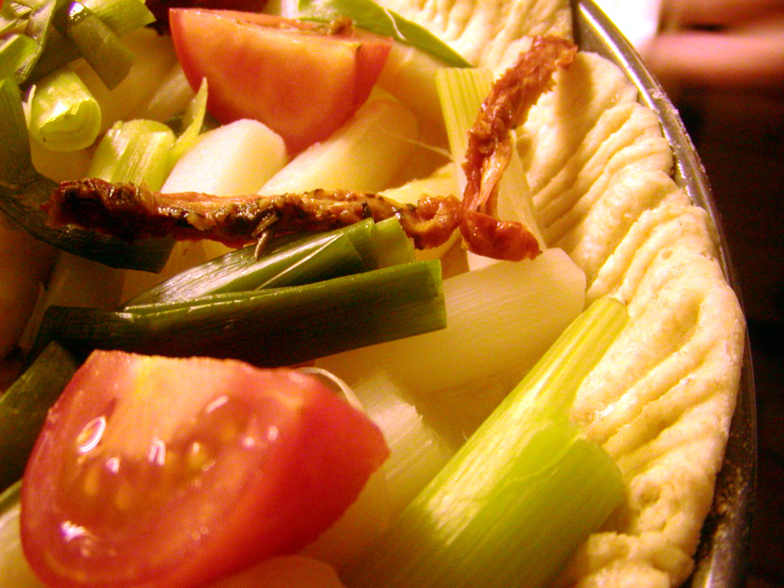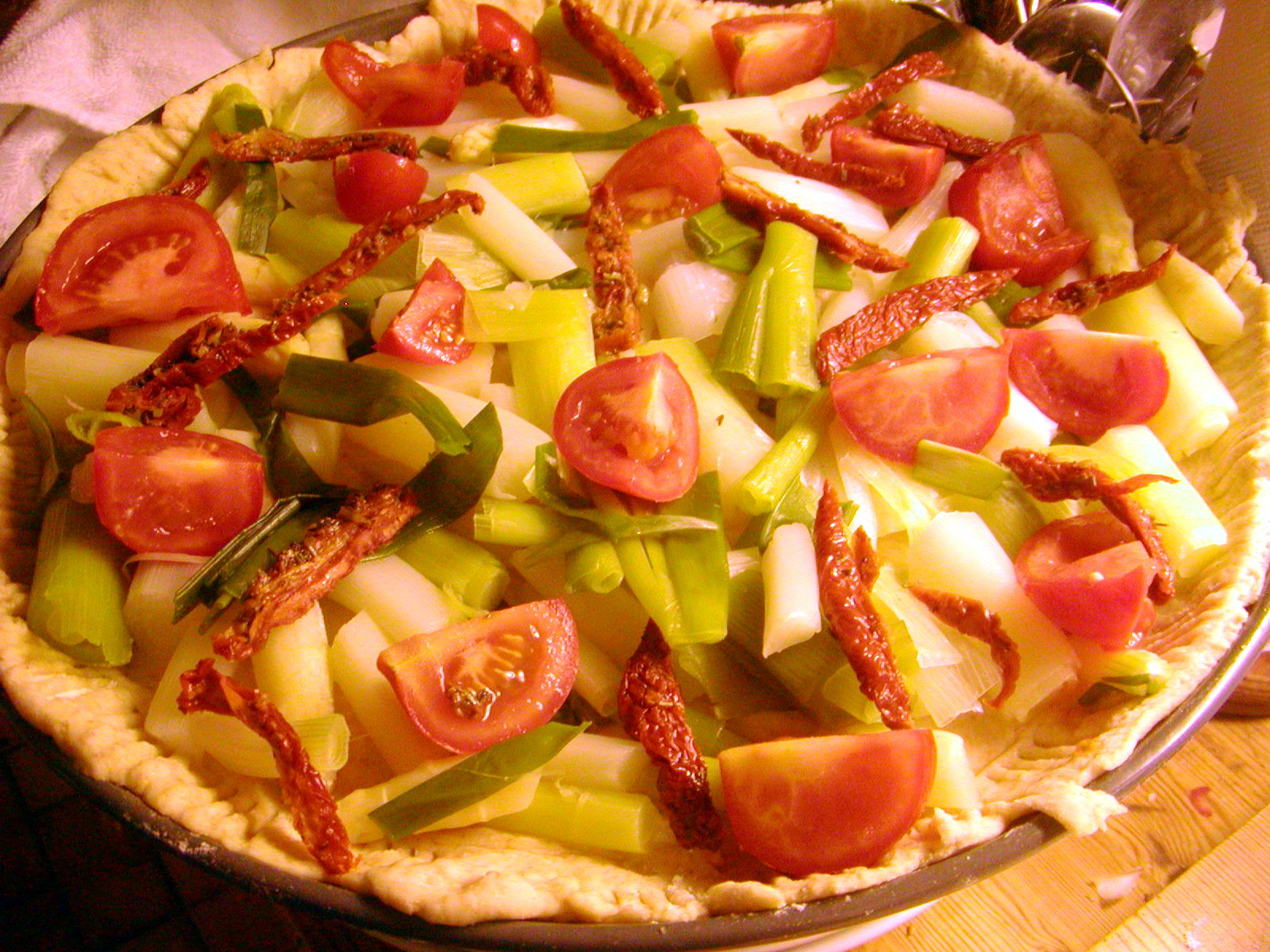 Nun alle Zutaten des Teiges miteinander verkneten. Wenn der Teig zu fest wird, ein wenig Wasser dazugeben und einarbeiten. Teig ausrollen und entweder auf ein Blech legen oder Pizzaform oder was auch immer. Der Belag, das Gemüse kann je nach Geschmack oder Vorliebe variieren. In diesem Fall waren es ein Kg grüner Spargel und Tomaten. Wieviel davon ist auch Geschmacksache. Spargel klein schneiden, waschen und kurz vordünsten. Dann Gemüse auf dem Teig verteilen. Nach Geschmack Pomodoristreifen über dem Gemüse verteilen, gibt dem Ganzen einen pikanten Geschmack . Zum Schluß 25o oder 500 g Joghurt, je nachdem wie groß die Quiche ist mit einem Ei und Gewürzen,wie Kräutersalz, frisch gemahlenem schwarzem Pfeffer und einem Teelöffel Curry und last not but last einem kleinen Schuß Rapsöl verquirreln. Dies dann auf der Quiche verteilen. Muß nicht unbedingt sein, aber man kann auf alles noch kleingeschnittene Mozzarella tun und dann ab in den Backofen. Auf mittlerer Schiene die Quiche 40 min auf 200 °C backen und dann servieren.