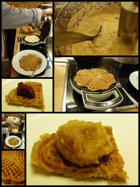 Ein Kilo Kartoffeln schälen in Stücke schneiden und zusammen mit einer geschälten und zerkleinerten Zwiebel, etwas Salz, einem guten Schuß Speiseöl, einem Päckchen Backpulver, geriebenem Muskat, einem aufgeschlagenen Ei, 200 Gramm Weizenvollkornmehl, ab in die Küchenmaschine und mixen. Dann den Teig in einem Waffeleisen zu Waffeln ausbacken.