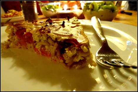 500 Gramm gegarte Spaghetti in dem Fall sind es Linguine und 500 gepellte Pellkartoffeln, kann auch weniger sein, in Scheiben geschnitten, zwei Paprikaschoten, in kleine Stücke zerteilt, vier mittelgroße Tomaten, ebenfalls klein geschnitten, Oregano gerebbelt, zwei bis drei Knoblauchzehen gehackt miteinander in einer Schüssel vorsichtig mischen. Dann die Mischung entweder in einer Auflaufform oder in eine genügend große Tarteform 30-40cm Durchmesser verteilen!