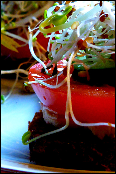bestreichen, Tomaten und Gurkenscheibe obendrauf und als Krönung selbstgezogene Sprossen!