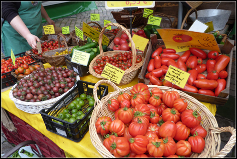 …diese Tomaten sind allerdings keine Supermarkttomaten, es sind heimische sozusagen ” Bremer UmzuTomaten ” aus Stuhr und sie sind so unvergleichlich aromatisch, sind so schmackhaft, daß man wenn man mal begonnen hat zu futtern, gar nicht mehr aufhören möchte! Erwerben kann man sie auf dem Bremer Findorffmarkt am Stand der Familie True. Zwischen neun bis zehn Sorten kann man auswählen oder so wie wir von jeder Sorte ein paar.