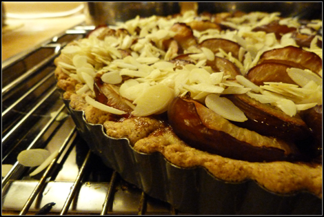 Gut durchkneten mit was auch immer. Dann eine gefettete Backform entweder aus Keramik oder Metall damit auskleiden, den Teig dick mit Marmelade der Wahl, am besten Pflaumenmarmelade bestreichen und mit entkernten und halbierten Pflaumen oder Zwetschgen belegen und mit Rohrohrzucker bestreuen. Im Backofen untere Stufe bei 200° 30 Min. backen. Mit Mandelplättchen bestreuen und evt. mit Vanilleeis servieren!