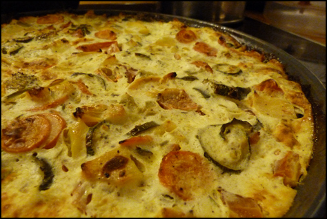 Einen Guß aus 500 Gramm Naturjohurt, ein wenig Rapsöl, Kräutersalz nach Geschmack, ebenso gemahlener schwarzer Pfeffer, etwas gerebbelter oder Frischer Oregano, gerebbelter Rosmarin, zwei bis drei aufgeschlagene Eier, zwei Zehen klein gehacktem Knoblauch herstellen und über der Gemüsemasse verteilen. Ab in den Backofen und auf der untersten Schiene, bei 200° 40 Min backen!