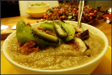Ein Apfel mit Schale, zwei Bananen ohne Schale, eine Birne mit Schale zerkleinern und mixen! Eine frische Feige und eine geschälte Kiwi zur Deko obendrauf und fertig ist das Smoothie! Natürlich kann man variieren und statt der Birne, die Kiwi und die Feige mit den Bananen mixen, je nach Lust und Laune!