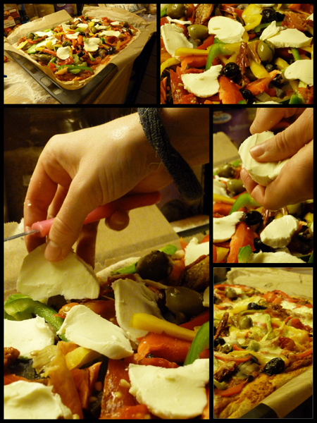 Pizzasoße auf dem Teig verteilen und den Teig belegen mit vorgedünsteten Champinons, Auberginenstücken, Zuchinischeiben, obendrauf Paprikastreifen, eingelegte Peperoni, Oliven und zum Schluß Mozzarellascheiben!
