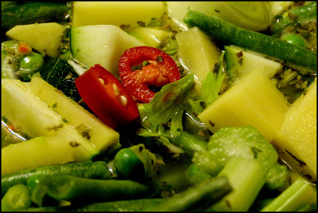 eine Handvoll gefrostete oder frische grüne Bohnen, ebensoviel gefrostete Erbsen, eine kleingeschittene Zuchini, drei bis vier geschälte und in Stücke geschnittene Kartoffeln, Stangensellie zerkleinert, ebenso eine in Stücke geschnittener Porreestange, Bohnenkraut gerebbelt nach Geschmack, zwei Knoblauchzehen, zwei Scheibchen frische Pepperoni, Drei in Stücke geschnittene Tomaten, eine kleine handvoll Spirelli oder Nudeln der Wahl.