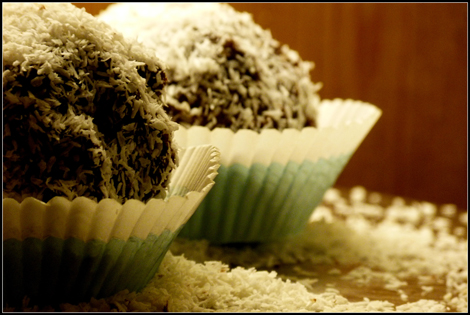 Nun aus dem Teig Kugeln formen und in Kokosraspeln wälzen!