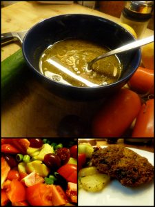 Fünf größere Pellkartoffeln entpellen und in Scheiben schneiden, dazu Paprikaschoten, Tomatenstücke, eine handvoll Weintrauben, Frühlingszwiebel in Stücken, Salatgurke in Scheiben oder Stücken. Die Salatsoße besteht aus mittelscharfem Senf, süßem körnigem Senf, Kräutersalz, schwarzem Pfeffer, einem guten Schuß Rapsöl, Apfelsaft, und wer will noch einen Eßl. Honig. Zutaten gut verrühren und unter den Salat heben. Mit den Coscousbratlingen servieren.