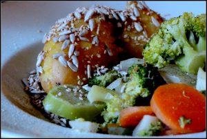 Kartoffeln pellen mit Rapsöl begießen und mit Sonnenblumenkernen und Sesam bestreuen. Die Kartoffeln mit dem Gemüse anrichten. Sowohl Kartoffeln als auch das Gemüse würzen mit Kräutersalz. Natürlich kann man auch das Gemüse kurz in Butter schwenken und läßt das Rapsöl weg.