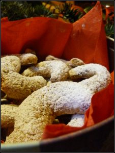 Alle Zutaten miteinander verkneten und eine Rolle formen. Von der Rolle Scheiben abschneiden und daraus Kipferl formen. Auf einem Backblech, im Backofen mittlere Schiene und bei 200° 15-20 Min. backen. Sofort vorsichtig vom Blech nehmen auf einen Teller legen und abkühlen lassen. Wenn abgekühlt entweder mit Puderzucker oder Kakaopulver bestäuben….