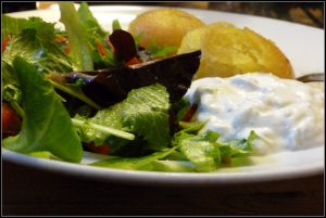 250 Gramm Quark mit Naturjoghurt, einer halben geraspelten Gurke, Kräutersalz, gemahlenem schwarzem Pfeffer, einem Teelöffel Honig, verrühren, natürlich kommen, wir dürfen es keinesfalls vergessen, noch ein paar kleingehackte Knoblauchzehen hinzu, auch unterrühren.