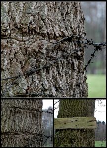 Dies hier ist eindeutiger Baumfrevel und kein Einzelfall! Baumstämme und Äste mit eingewachsenem Stacheldraht. Baumstämme an denen Zaunlatten mit Nägeln befestigt sind ect.Unsere Bauern sind leider wie wir wissen nicht besonders sensibel, was unsere Natur betrifft. Man sollte ihnen auch mal Stacheldraht um den Bauch schnüren und ein Brett an die Birne nageln, aber die, die so etwas tun, haben ja eh schon ein Brett vor dem Kopf….