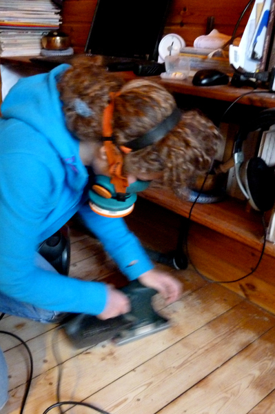 … denn in einem alten Haus gibt es praktisch immer etwas dergleichen zu tun! Diesmal ist der Fußboden dran. Dreißig Jahre sind es im kommenden Jahr her, seit wir das gesamte Haus renovierten und unter anderem den Holzfußboden im ersten Stock abzogen und lackierten. Dreißig Jahre hat’s gehalten, jetzt ist er also wieder an der Reihe. Seinerzeit hatten wir keine Helfer, heute schon, theoretisch jedenfalls. Doch! Maxi läßt sich erbarmen, ihr Bruder nicht so leicht und übt vornehme Zurückhaltung! -