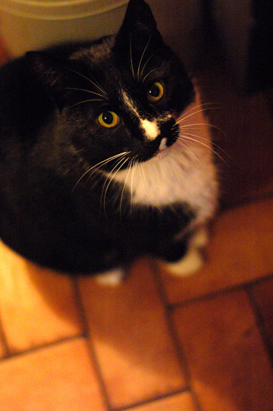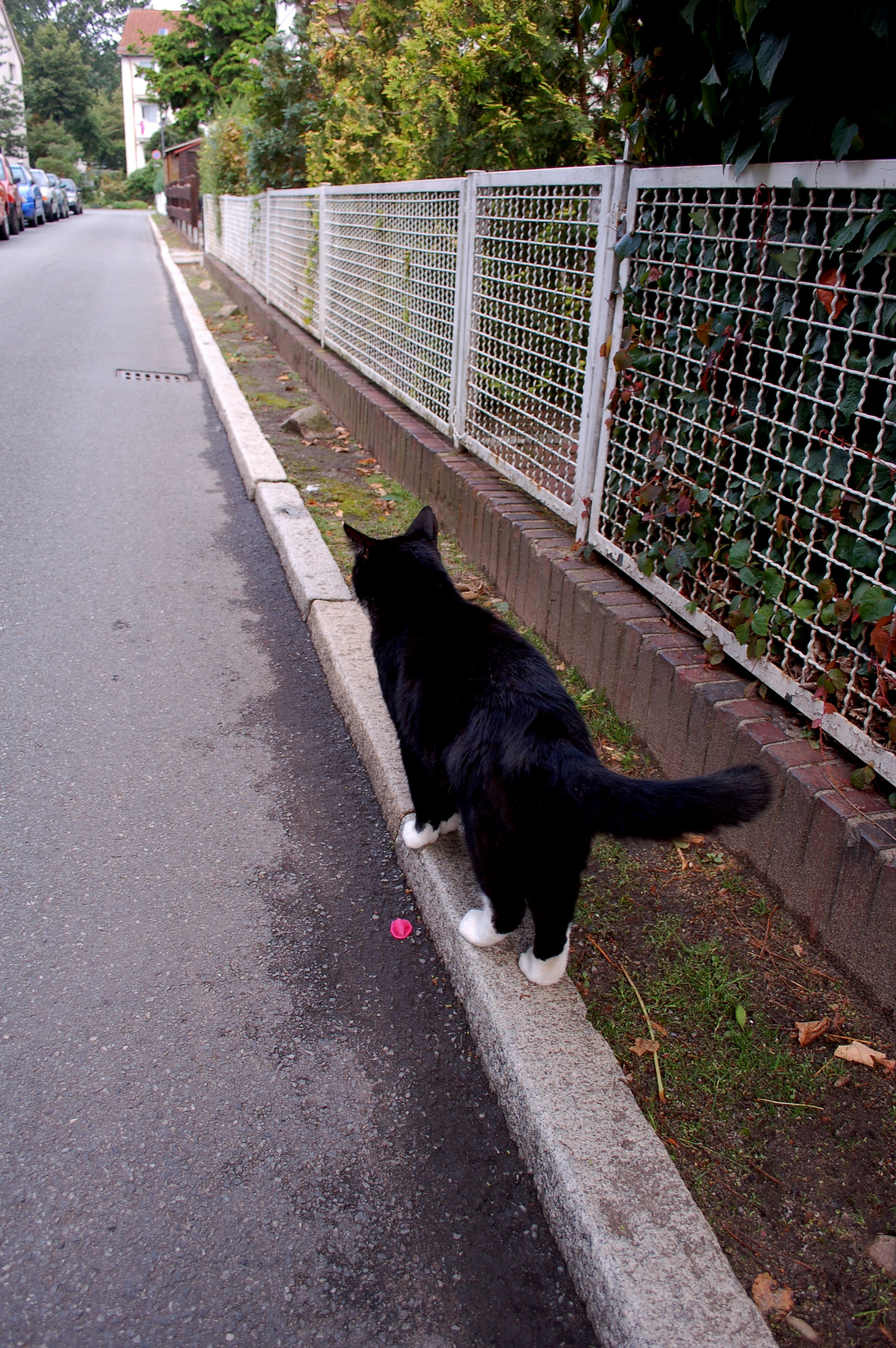 Dicker Max, wir wissen nicht wie er wirklich heißt, ist ein seit kurzem ausgesetzter, ein von seiner Familie verlassener Kater. Aber es scheint ihm trotz allem wenigstens körperlich nicht schlecht zu gehen. So, wie bei uns, wird er wohl noch von diversen anderen mitfühlenden Zweibeinern gefüttert. Da unser Kater Bisi, das Kampfaas,sich mit seinem sanften moppeligen Doppelgänger nicht gut versteht, müssen wir ihn stets heimlich füttern, das bedeutet, Bisi darf auf keinen Fall Wind davon bekommen und schön hinter der geschlossenen Küchentür bleiben, wenn dicker Max um Fütterung bittet. Früher blieb er noch ein Weilchen nach seiner Sättigung bei uns zum Schmusen, jetzt aber verschwindet er, gehetzt um sich blickend so schnell, wie möglich. Das verschwinden seiner Familie scheint seelisch an ihm nicht spurlos vorbei gegangen zu sein!