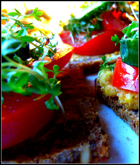 Vollkornbrotscheiben mit Tartex oder einem Brotaufstrich der Wahl bestreichen, mit Tomaten und Gurkenscheiben garnieren mit Kräutersalz und schwarzem gemahlenem Pfeffer bestreuen und ganz obenauf ein Kressesträußchen!