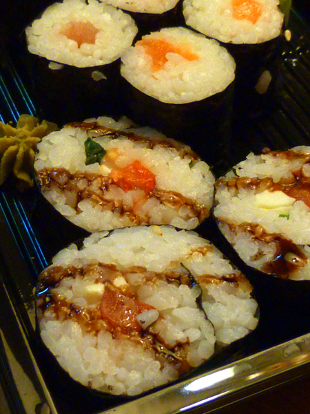 …aber weshalb nur? Nur mal so zum reinschnuppern besorgten wir uns kürzlich die kleinen Klebereisröllchen! Bei der Schnupperei wird es vermutlich auch bleiben, denn so scharf wir auch zunächst auf die fernöstlichen Genüsse waren, Sushi macht das Gegenteil von satt, nein, man futtert sich geradezu hungrig. Ich esse zwar gelegentlich Fisch aber denn doch keinen rohen! Zu allem Überfluß muß diese relativ geschmacksneutrale Kost erst durch Wasabi, eine Meerrettichpaste aufgepeppt werden, um schmackhaft zu werden. Nein, da lobe ich mir beispielsweise die mediteranen Köstlichkeiten bei denen der Geschmack nicht nachträglich hinzugefügt werden muß! -